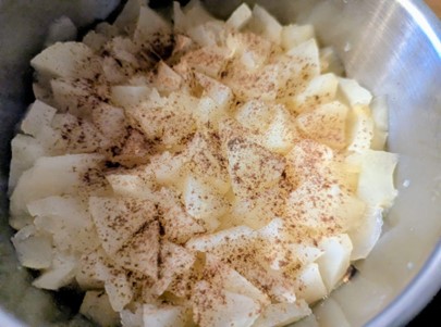 Ich warf einen Blick auf die Zutaten: Sojajoghurt, pflanzliche Margarine, Vollkornmehl, Zimt – aber keine Äpfel in der Küche 😕. Ich zog die Gummistiefel an und ging in den Garten. Zurückgekehrt mit zwei vollen Körben, begann ich, die Äpfel zu schälen, zu entkernen und zu schneiden. Anschließend vermischte ich alle Zutaten. Nach 45 Minuten genoss ich einen himmlisch leckeren,warmen Apfelkuchen mit Zimt.